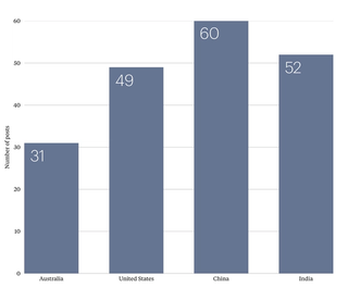An Indian Ocean post is defined as any Embassy, Consulate or Mission to a country or multilateral institution based in any city in an Indian Ocean country. For this analysis, US and Chinese posts in Australia and India are counted.